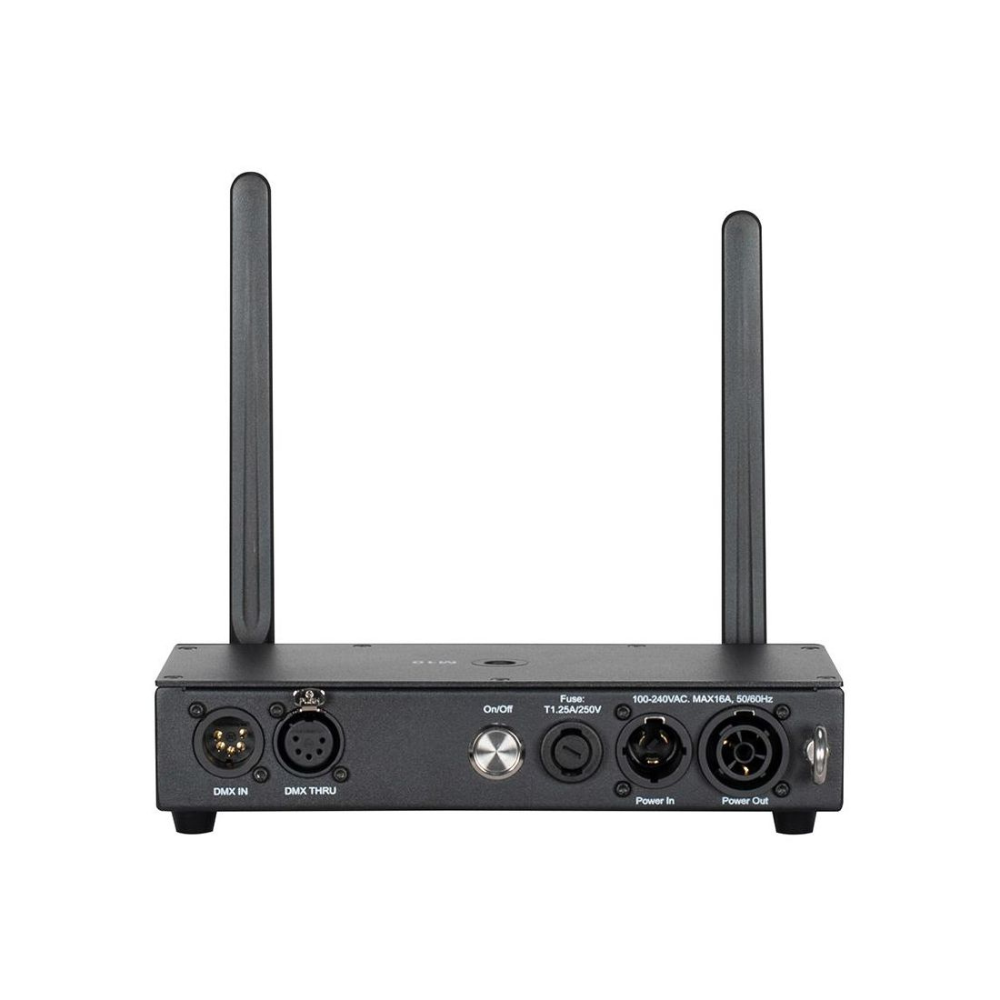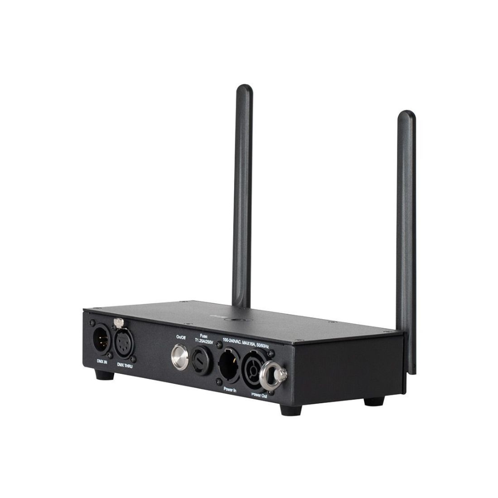 - Connectoren: 5-pins XLR DMX in/uit, JT SMA antenne, DC-barrel 2,5/5,5 mm, vergrendelbare power in/out
