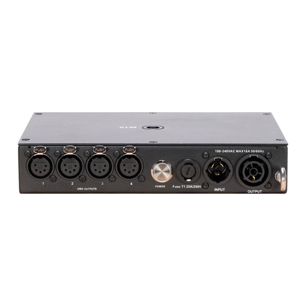 - 4x 5-pins-XLR-in-/uitgangen met DMX-/RDM-/ArtNet-/sACN-aansluiting voor een rijke lichtinstallatie