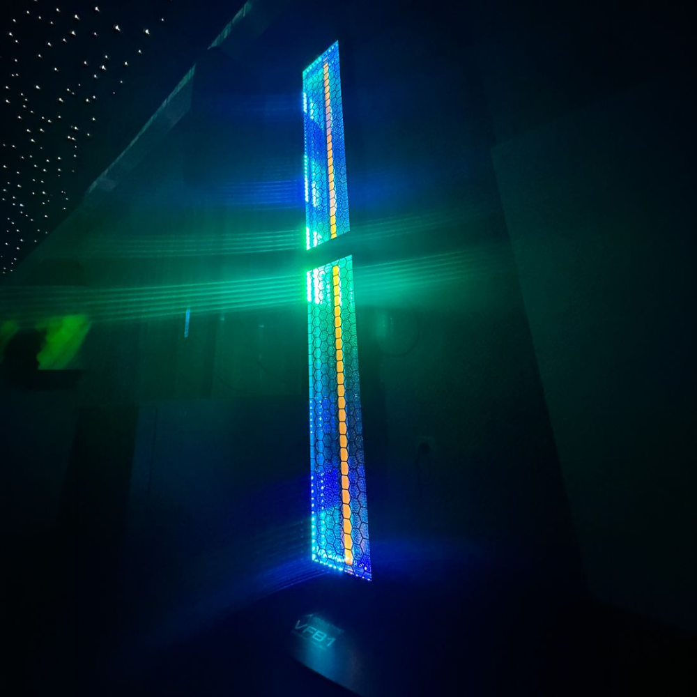 - Achtergrond: 120x SMD 5050 RGBL LED (0,8 W elk), 20 pixelgroepen