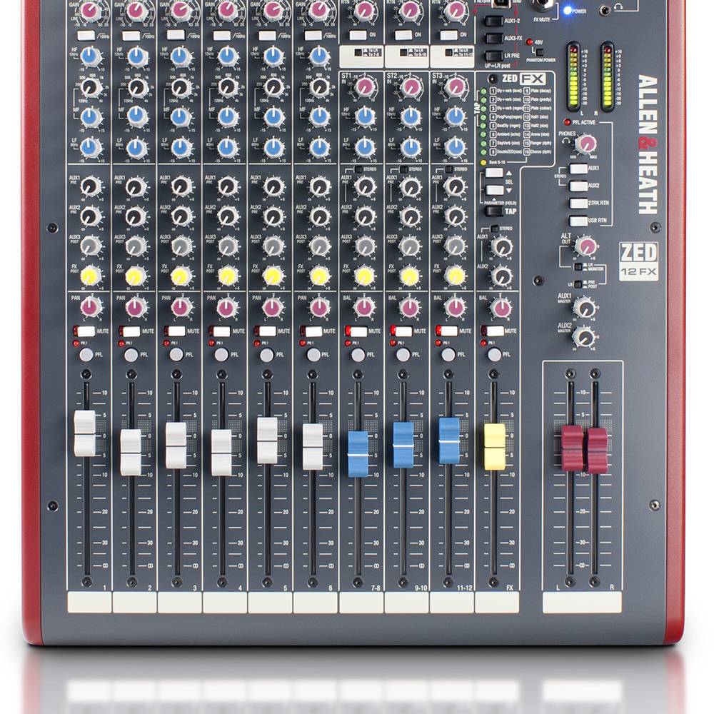 Het mooiste van deze mixer is nog wel de effectenunit. Vanaf nu geen gesleep meer met aparte effectunits of racks. De belangrijkste effecten zitten intern in de ZED-12FX. Via enkele knopjes kan snel en eenvoudig een keuze worden gemaakt uit de 16 effecten. Per kanaal kan worden ingesteld in hoeverre het effect invloed moet hebben op het signaal. De faders op de Allen & Heath ZED-12FX hebben allemaal hun eigen kleur, zodat direct inzichtbaar is of we met een mono-, stereo- of effectkanaal te maken hebben. De masterschuiven zijn in rood afgewerkt.