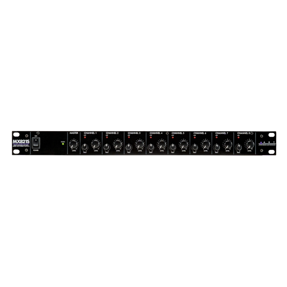 Voor veelvuldige microfoongebruikers is er de ART MX821S: een stereomixer die met 8 kanalen de meeste heeft van alle ART-rackmixers. Elk kanaal heeft een XLR- én lijningang met onafhankelijke regelaars voor niveau en panning, indicatoren voor clipping en schakelbare 48 V-fantoomvoeding. De lijningangen kunnen ook worden omgezet naar een directe uitgang, via de interne jumpers.