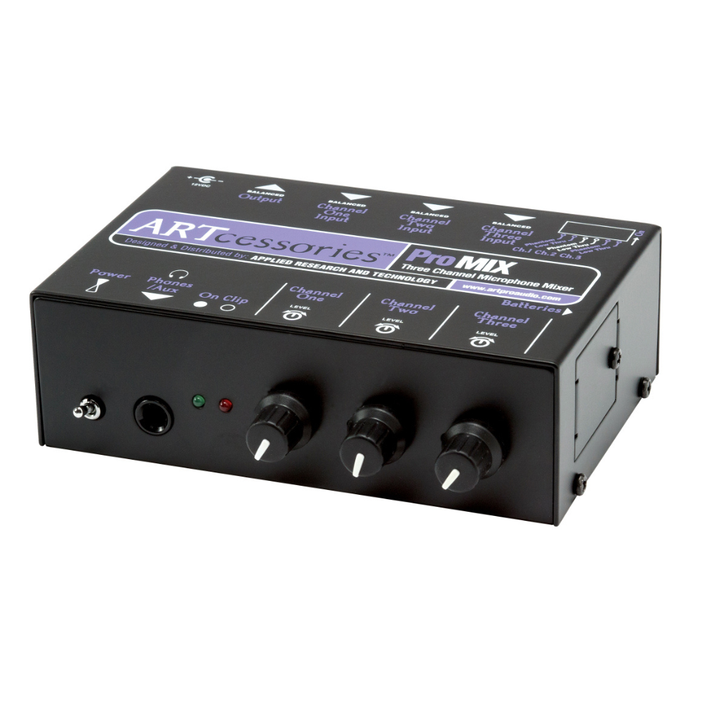 De ART ProMix 3-kanaals microfoonmixer is een cool klein doosje dat meerdere microfoonsignalen via één XLR-uitgang aansluit op een grotere mixer. De 3 gebalanceerde XLR-kanalen hebben ieder een lage impedantie, en regelaars voor 12 V-fantoomvoeding, level en low-cutfilter. Nadat je klaar bent met tweaken stuur je de mix uit via de 1/4 inch-hoofdtelefoon/aux-poort of de gebalanceerde XLR-/lijnuitgang.