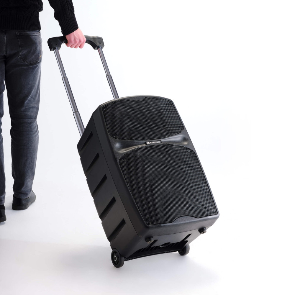 - Uitschuifbare handgreep, transportwielen en opbergvak voor 2 microfoons en kabels