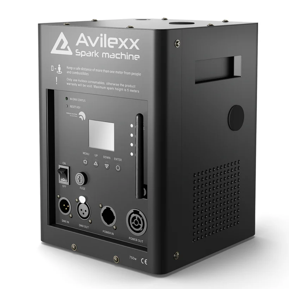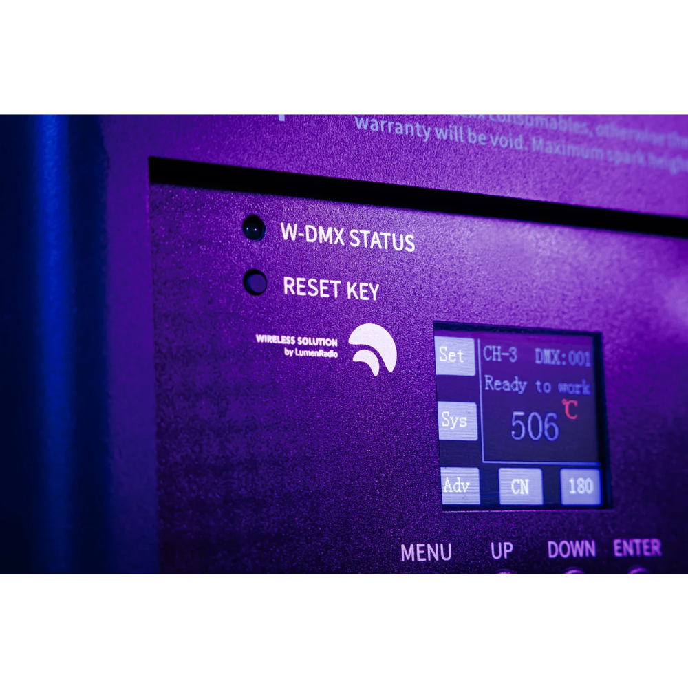 De Avilexx Sparkus 1 heeft een ingebouwde Wireless Solution Lumenradio W-DMX ontvanger voor stabiele draadloze controle. Ook biedt het koudvuurfontein een traditionele DMX-connectie via 3-pins XLR. Liever snel starten? Gebruik de afstandsbediening en het duidelijke kleurendisplay. Veiligheid is standaard bij Avilexx met sensoren voor temperatuur, overstroombeveiliging en een zelfreinigende functie.