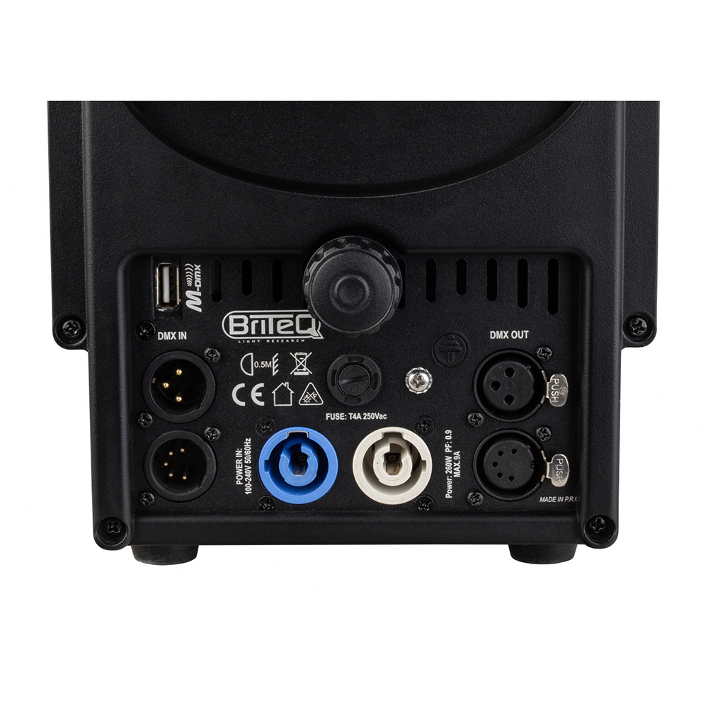 - Connectoren: 3-pins en 5-pins DMX in/uit, PowerCON compatibel in/uit