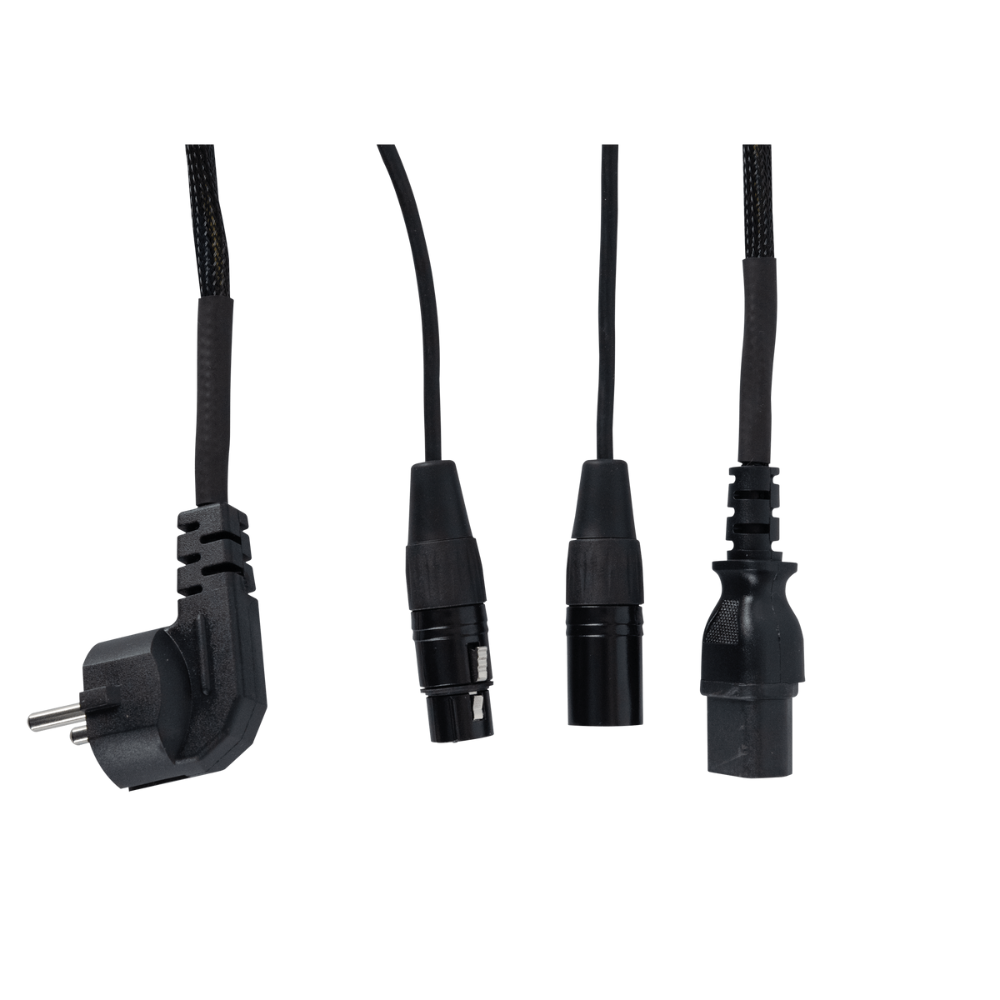 De DAP FP08 kabel heeft aan de ene kant een 230V schuko stekker en een XLR female. De andere kant van de kabel is voorzien van een IEC female en een XLR male connector. De lengte is 20m.