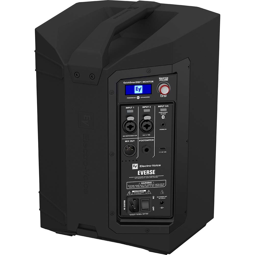De Electro Voice Everse 8 is uitgevoerd met een 4-kanaals digitale mixer met effecten van studiokwaliteit. Daarnaast kan de speaker 48V fantoomspanning leveren én zorgt hij voor feedbackonderdrukking. Zijn 400 watt versterker en DSP zijn ontwikkeld in samenwerking met het gerenommeerde merk Dynacord. Daarnaast zijn er nog een paar leuke extraatjes te vinden op de Everse 8. Zo is er een USB-oplaadpoort én kun je er via de 12V DC-poort stroomaansluiting een ander apparaat zoals een draadloos microfoonsysteem op aansluiten.