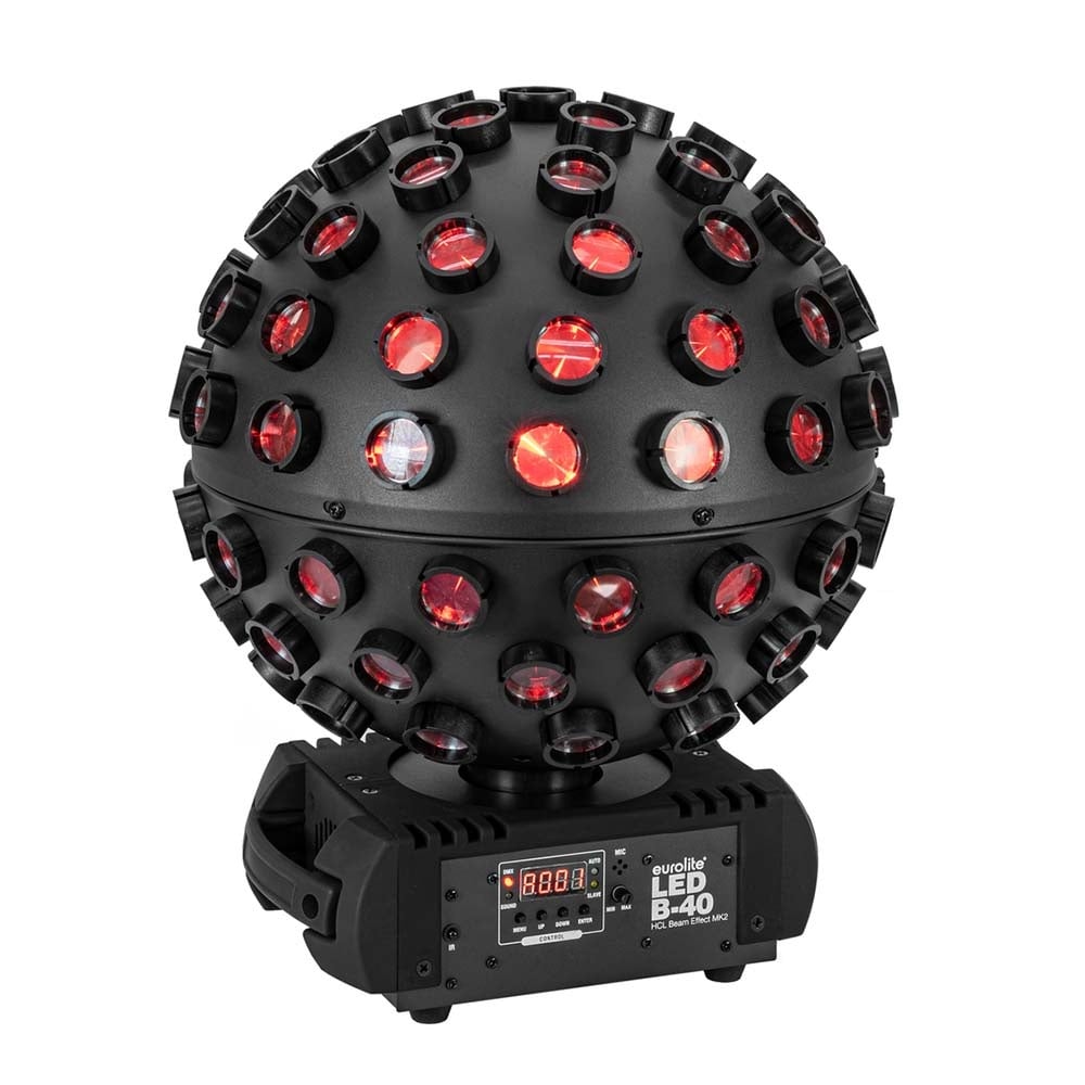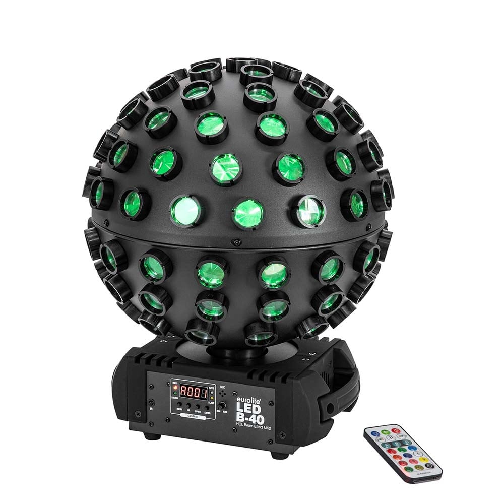 Met deze led-discobal is het niet moeilijk om een feestje te bouwen. De Eurolite LED B-40 HCL MK2 is namelijk uitgevoerd met vijf leds van 10 watt elk. Dit zijn zogenaamde 6-in-1 leds die allemaal de kleuren rood, groen, blauw, amber, wit en UV in zich hebben. Dit maakt het mixen van kleuren mogelijk en hierdoor zijn er talloze tinten te creëren. Dit gekleurde licht schijnt door de vele lensjes van de LED B-40 HCL Beam Effect waardoor er een heleboel lichtstralen de zaal in schijnen. De motor van het lichteffect laten hem draaien.