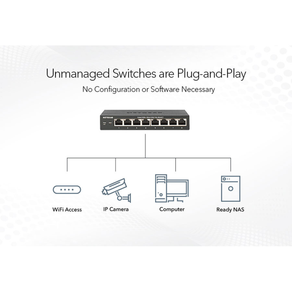 De Netgear GS108 netwerkswitch is een 8-poorts Gigabit switch met plug-and-play installatie. Hij heeft een duurzame metalen behuizing, werkt stil, is energiezuinig (IEEE 802.3az) en levert betrouwbare, maximale netwerkprestaties.