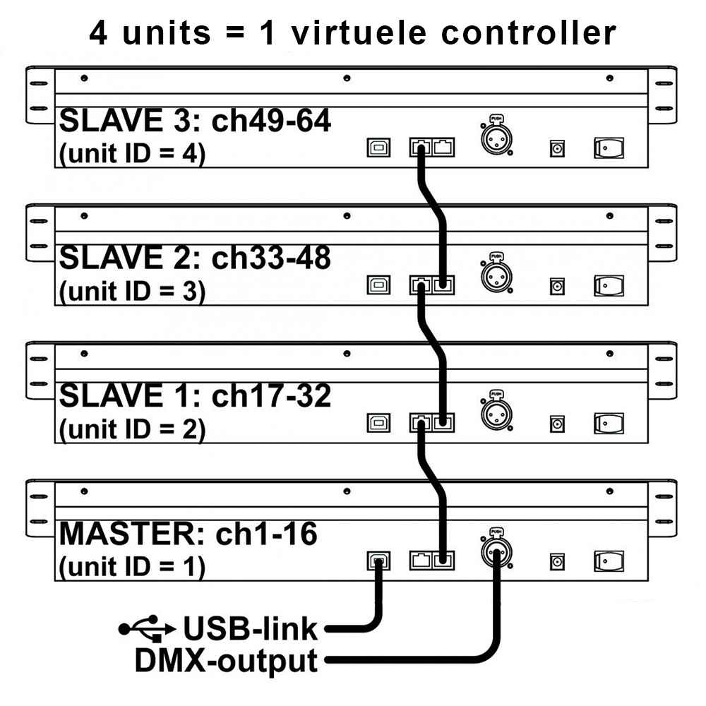- Modi: 16-kanaals dimmer modus en scene modus (16 scenes met ieder 16 kanalen)