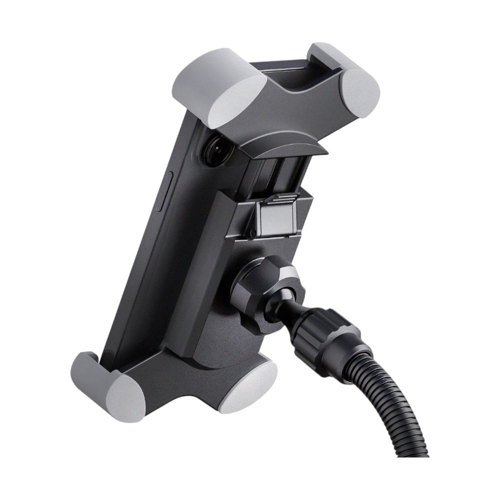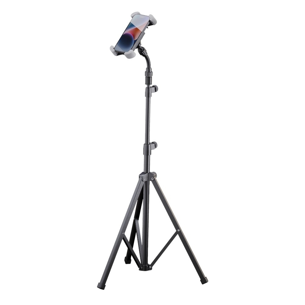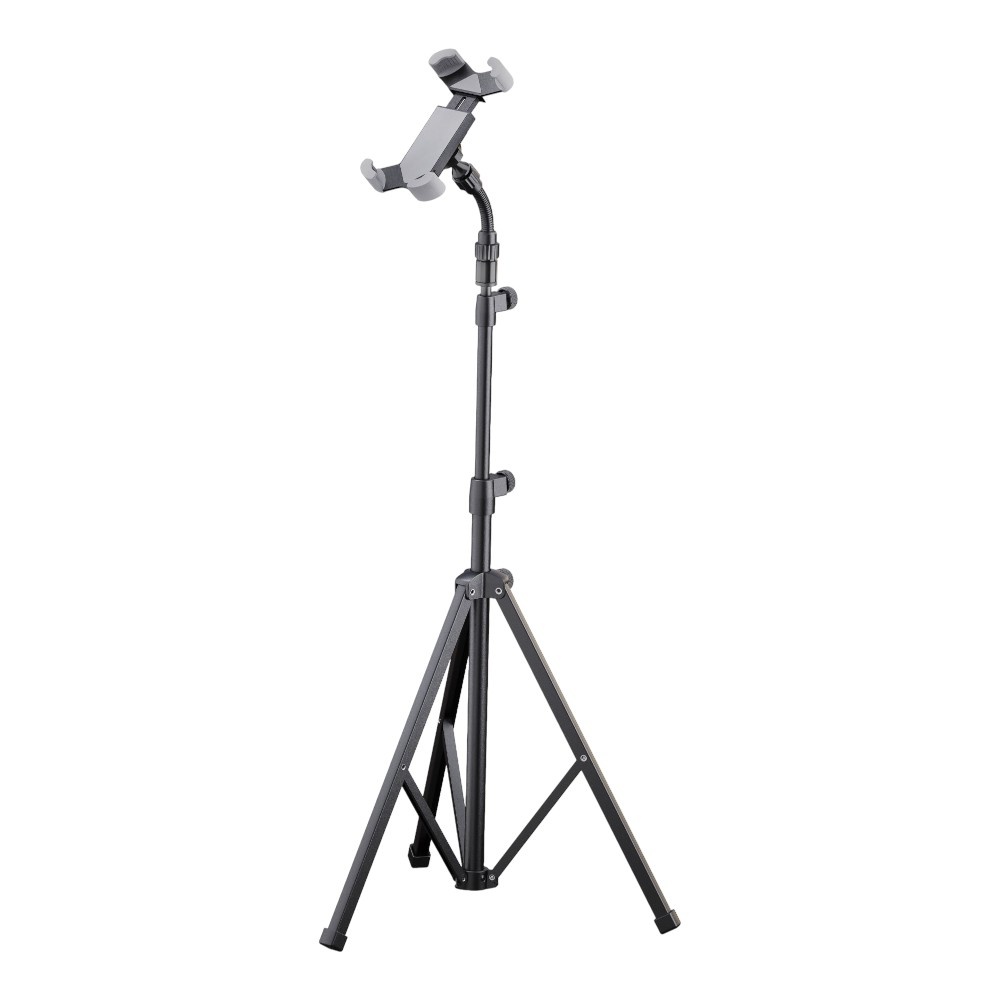 De K&M 19759 smartphonestatief is een universele houder voor platte apparaten met een breedte van 55 tot 85 mm. Verstelbaar in hoogte van 600 tot 1400 mm en gemakkelijk te bedienen via de quick-release knop aan de achterzijde en 360 graden-kantelbaar.
