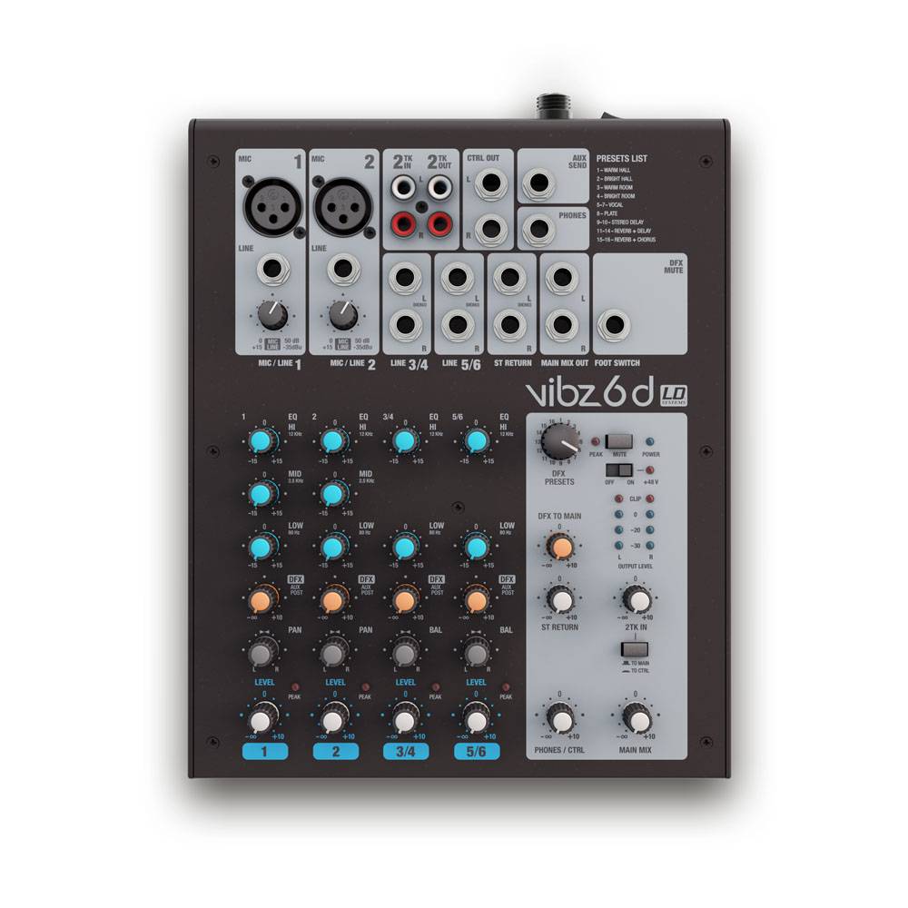 De LD Systems Vibz 6D is één van de compacte mixers uit het assortiment van LD Systems. Het maakt hem geschikt voor entertainers, studiotoepassingen en one-man shows. De Vibz 6D biedt 2 microfooningangen en 2 stereo-aansluitingen.