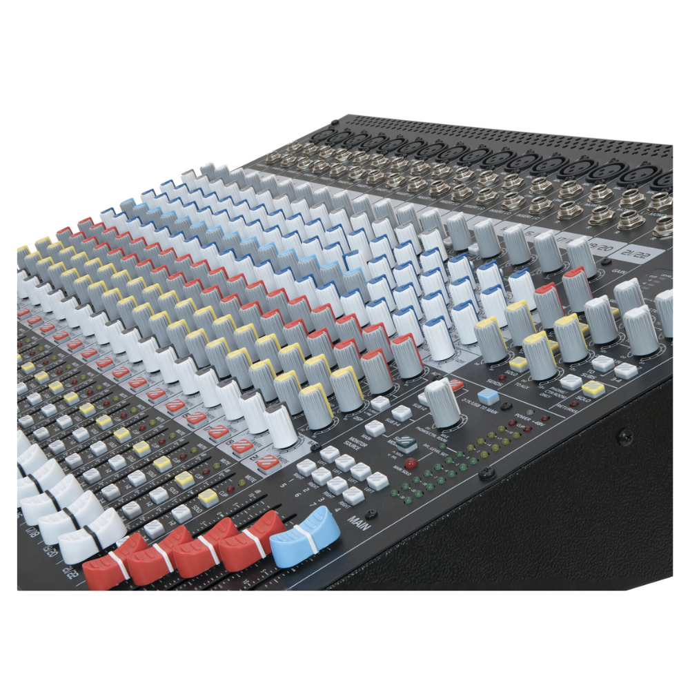 - Gebalanceerde XLR-main outs en stevige 60 mm faders