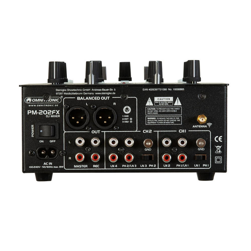 Specificaties Omnitronic PM-202FX 2-kanaals dj-mixer met filter, FX en Bluetooth:
