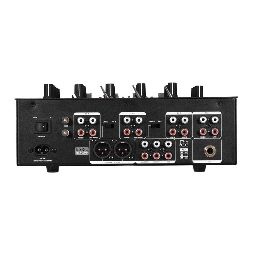 - Vier line/phono-kanalen met eigen fader, 3-band EQ, gain en LED levelmeter