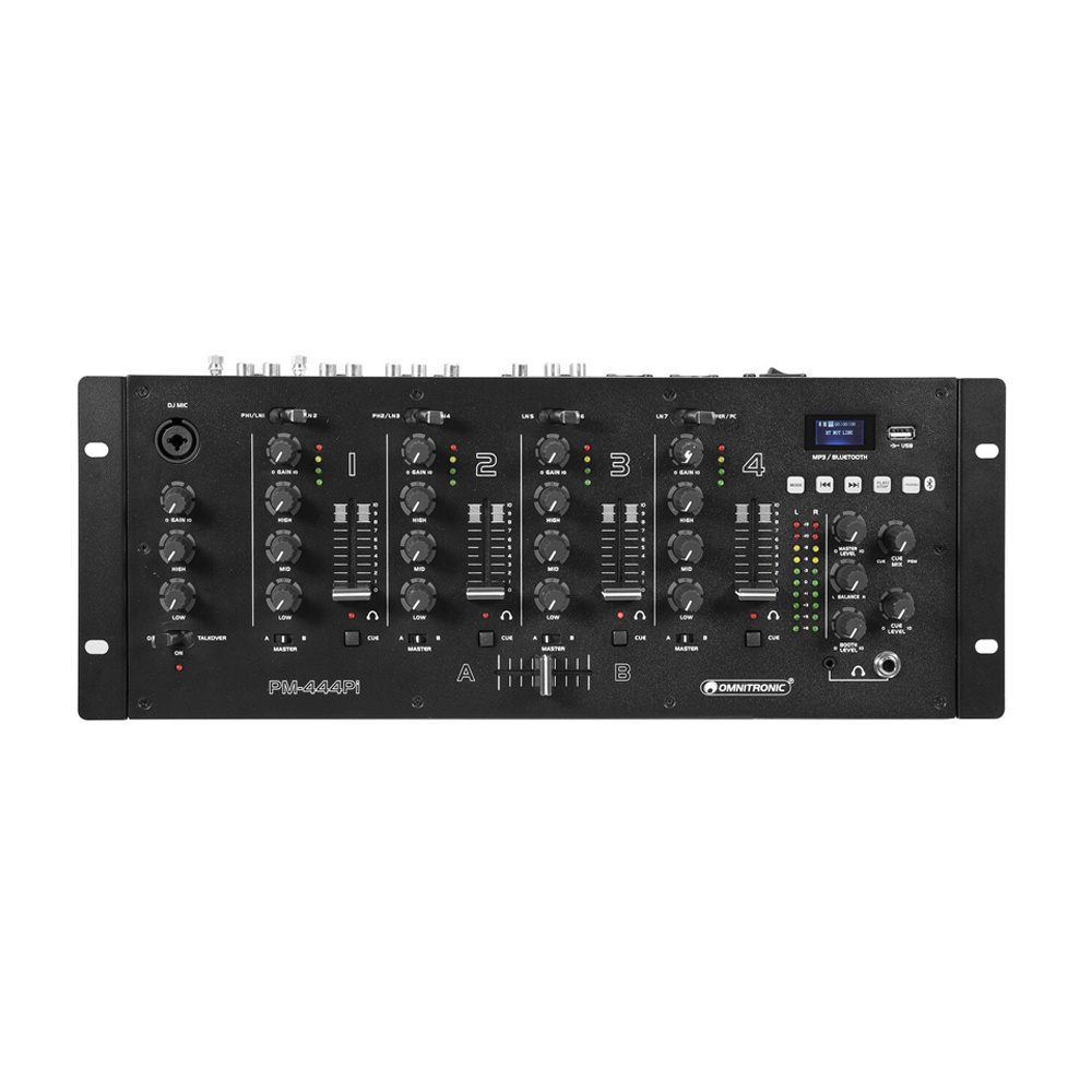 De Omnitronic PM-444Pi 3-kanaals dj-mixer met Bluetooth, MP3 speler en USB interface is een all-in-one rackmixer. Speel vanaf USB, laptop of smartphone en mix met cue-opties en een toewijsbare crossfader.
