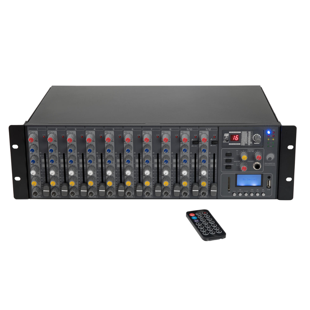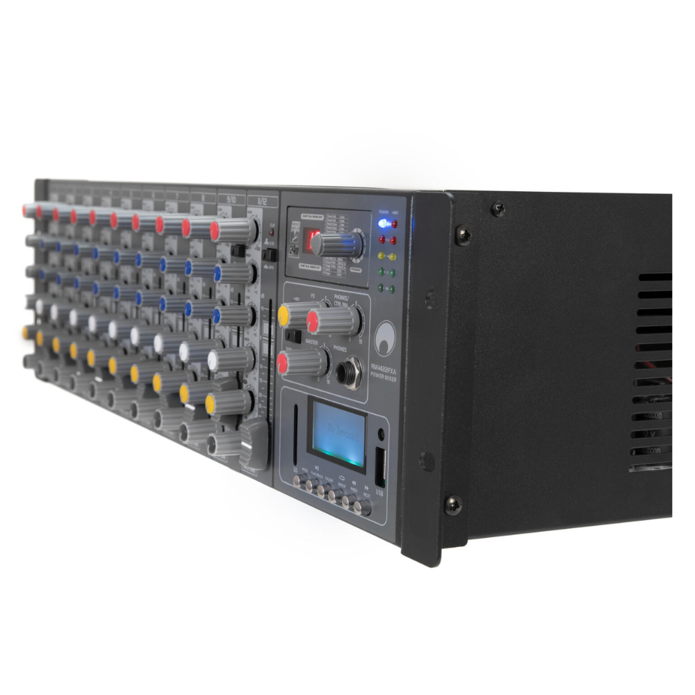 - Type: power rackmixer met USB audio-interface, DSP en MP3-speler