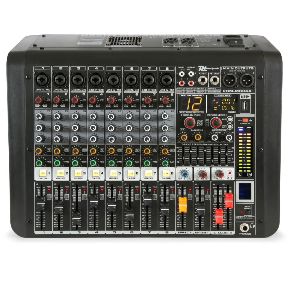 De Power Dynamics PDM-M804A 8-Kanaals studiomixer met versterker is een compacte alles-in-een mixer voor podium. Mix 8 bronnen, gebruik effecten en speel via Bluetooth of USB. Met 2x200W eindversterker stuur je direct passieve speakers aan.