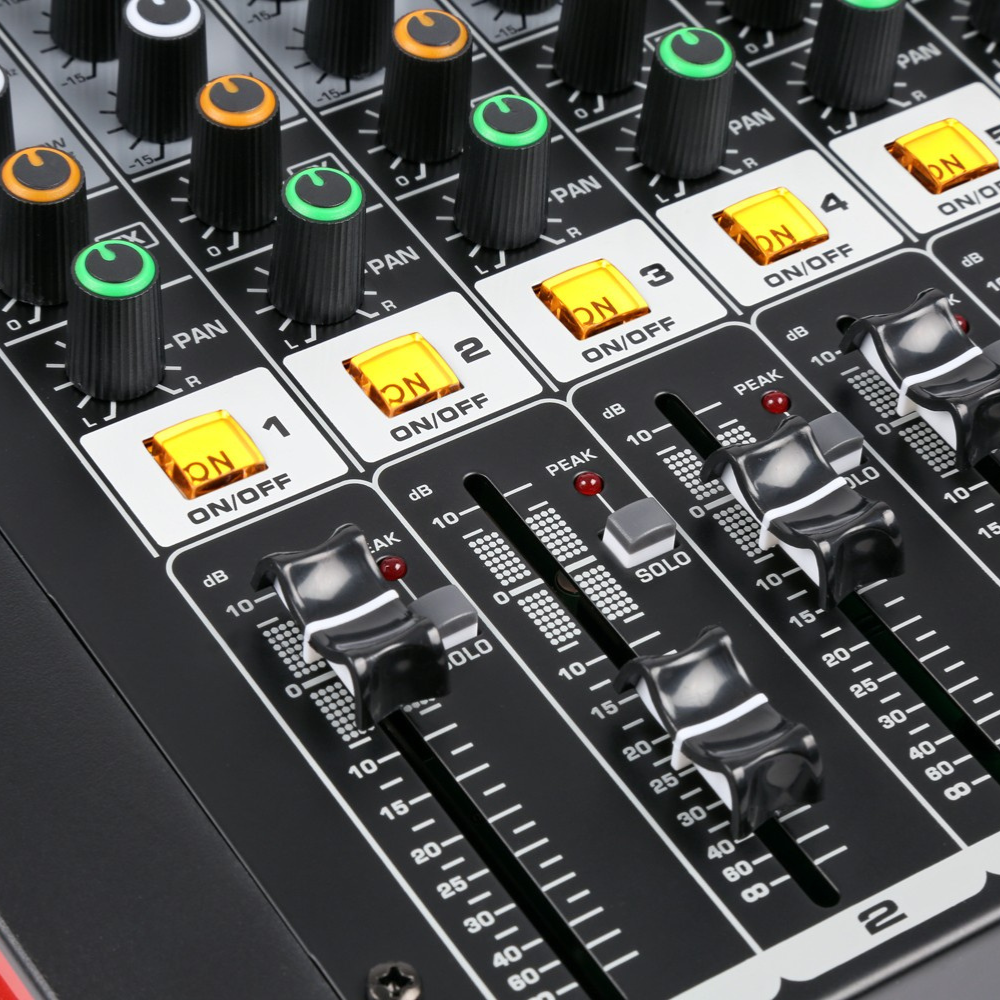 Je wilt grip op je sound zonder ingewikkelde menu’s. Daarom combineert de Power Dynamics PDM-M804A per kanaal een vertrouwde indeling met Trim, 3-bands EQ, Pan, FX en praktische mute- en solo-functies (PFL). Op de master help je de 7-bands grafische equalizer om je zaal of livestream strak af te stemmen, terwijl de 24-bit multi-FX processor met 16 presets zoals reverb, delay en echo je mix meteen diepte en ruimte geeft. Dankzij de duidelijke LED VU-meter en peak-indicatie houd je met de Power Dynamics alles overzichtelijk.