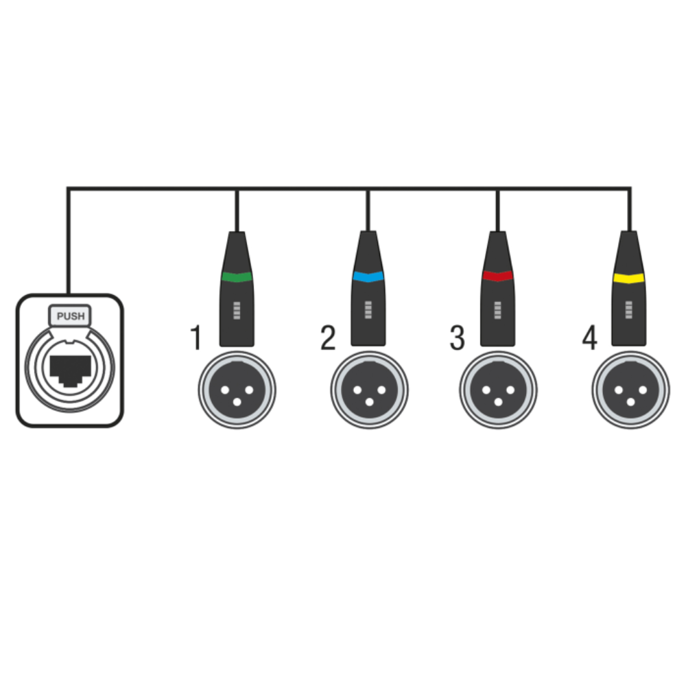 De Showgear CS-4F/3 kabelsplitter 4x DMX female naar 1x RJ45 male maakt van 1 RJ45-lijn 4 overzichtelijke DMX-uitgangen (3-pins XLR-female). Zo stuur je data van 4 universes via één enkele CAT-kabel. Inclusief kleurcodering voor een foutloze aansluiting.
