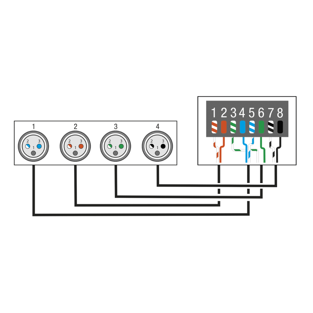 - 8x 3-pins XLR-connectoren en 2x RJ45-connectoren