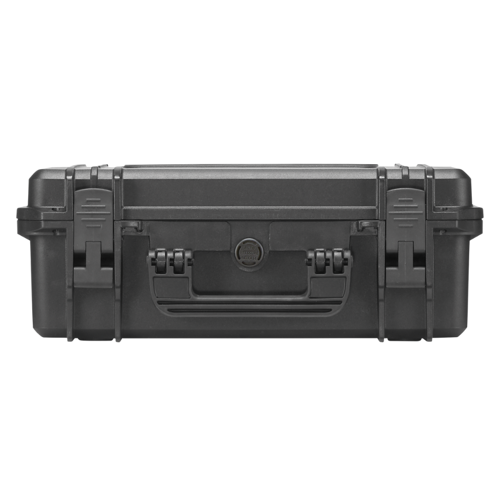 De Showgear Vaultis Case 430 universele kunststof koffer beschermt je AV-gear onderweg met een stootvaste, waterdichte behuizing, flexibel schuim en wielen met intrekbare handgreep; plus luchtdrukventiel voor soepel openen en reizen.