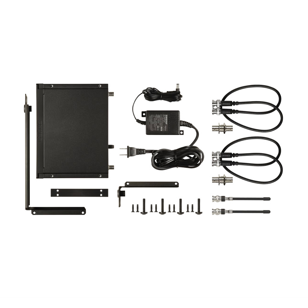 Het signaal vanuit het instrument komt nu binnen bij de Shure BLX4R ontvanger. Deze ontvanger heeft wat voordelen ten opzichte van zijn BLX4 broertje. De toevoeging van de R geeft aan dat het hier gaat om een ontvanger die rechtstreeks in een 19 inch rack of flightcase geplaatst kan worden. Hiervoor worden rackmounts meegeleverd. De afneembare antennes kunnen dan aan de voorzijde worden geplaatst. Ook heeft de BLX4R een beter LSD-display dan zijn broertje en geeft hij de batterijstatus weer op de voorzijde van de ontvanger.