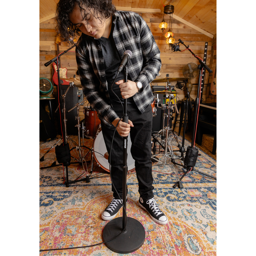 De Shure RBMICSTAND10 microfoonstatief met ronde voet is een ideaal statief voor liveoptredens of studio-opnames. Verstel de hoogte van 889 tot 1625 mm en geniet van een slipvrije, ronde basis die vibratiestoringen tegengaat. Voor 5/8 en 3/8 inch montage.