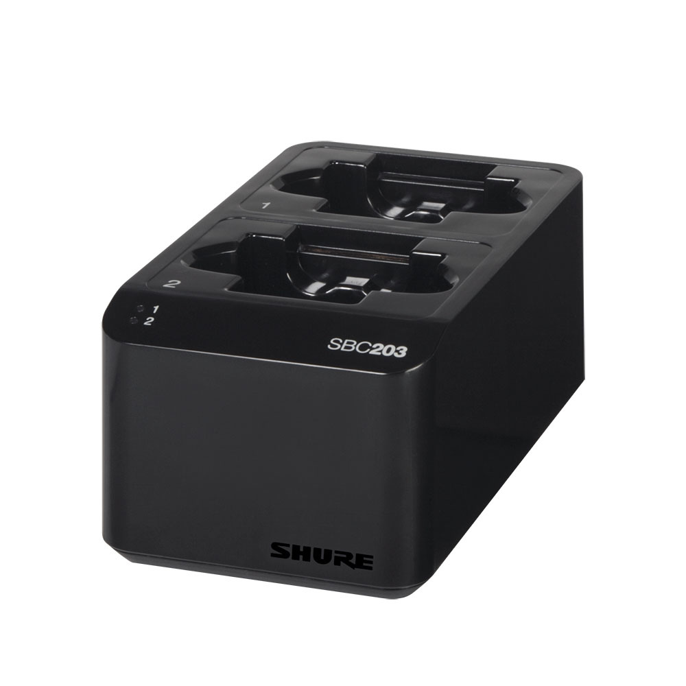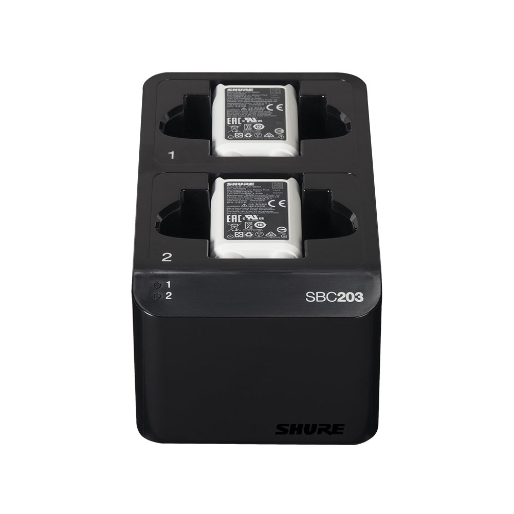 Met de Shure SBC203 kun je twee SB903 accu's tegelijkertijd opladen. Een uiterst handig aspect van de dubbele SLX-D acculader is dat je er ook gewoon handheld- en bodypackzenders in kunt steken, evenals losse accu's.