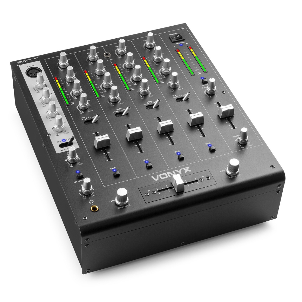 De Skytec STM-7010 is een DJ mixer die ondanks zijn lage prijs toch voorzien is van behoorlijk wat mogelijkheden. We zien 4 kanaalschuiven en een masterschuif. Deze 4 faders zijn toegewezen aan diverse audio-aansluitingen. Je kunt op deze mixer CD-spelers, MP3-spelers of draaitafels aansluiten. Per kanaal kun je met de toonregeling nog wijzigingen aanbrengen. Ook kun je aan de hand van de LED's zien hoe hard het kanaal de mixer ingestuurd wordt.