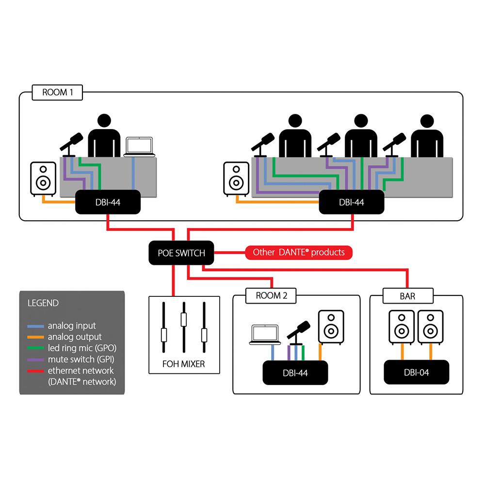 - Type: analoge/Dante netwerk-audiobrug voor vaste installatie