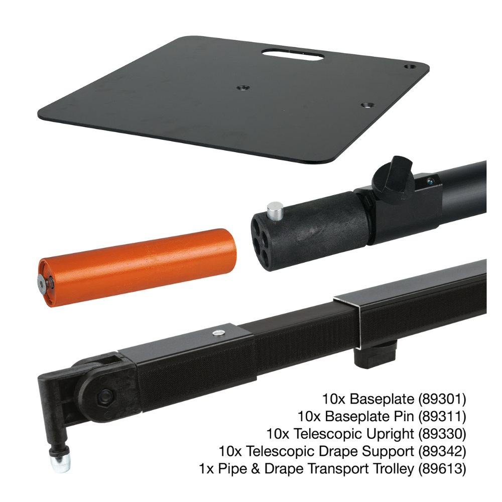 De Wentex Pipe and drape transport trolley met hardware set 3m geeft je alle materialen en onderdelen voor het opbouwen van de perfecte backdrop. De hardware set is ontworpen voor een snelle en gemakkelijke op- en afbouw, vervoer en opslag, zodat jij gerust aan de slag kan op locatie. De Wentex Pipe and drape set bevat naast de transport trolley, 10 baseplates van 8 kg, 10 basplate pins van 200 mm en 10 staanders en 10 liggers van elk 180 tot 300 cm. Enkel de gordijnen zijn niet meegeleverd. Die koop je apart, zodat je altijd keuze hebt in kleur en materiaal.